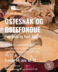 Før middagen fortæller Fransesco, som driver “Tilda og Karl”, om hvorfor han serverer ostefondue i København og om restauranternes rolle i (forandringen af) vores madsystem. Og så stiller oplægsholderen fra Slow Food ostespørgsmål til Jürg og Mike – forhåbentlig som en livestreamet Zoom samtale – alternativt som en video. F.eks. om hvorfor Jumi med håndkraft trillede en 100 kg Emmentaler ost 150 km tværs gennem Schweiz? Den verdensberømte Emmental ost er optaget i Slow Foods biodiversitetskatalog “Smagens Ark”. Har du også et ostespørgsmål?